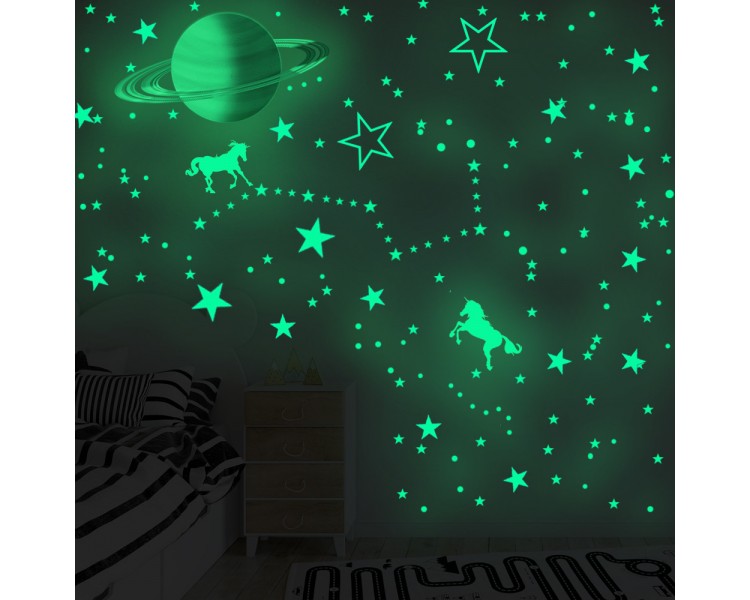 More than 100 stars and dots. Two unicorns and Saturn . All Luminous.