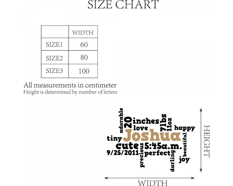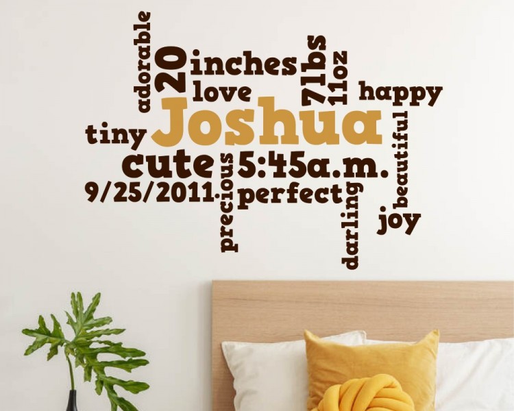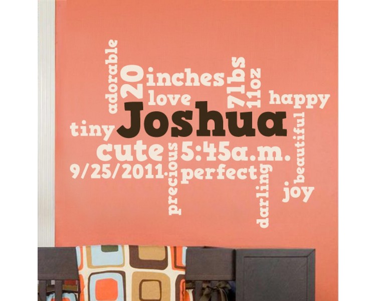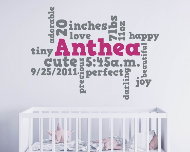 This beautiful customizable word cloud wall decal for a kids room or nursery will add that special touch to your little one's room. Add your child's Name, Weight, Length, Birthdate, and Time to memorialize this wonderful bundle of joy in your life.
