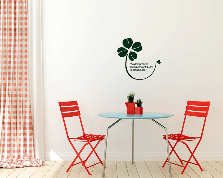 This wall decal is about a lucky four leaf clover with the quote who says: Anything you are good at contributes to happiness.
