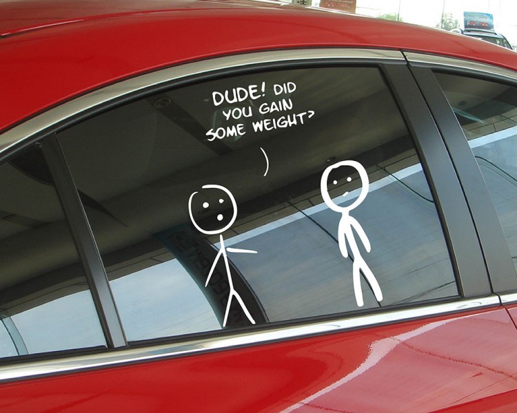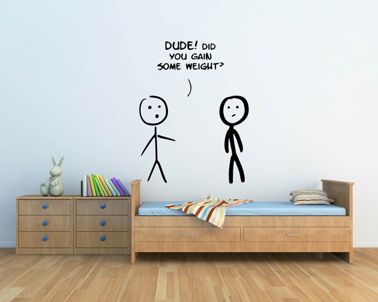 This wall decal is about 2 cute figures with the say: Dude! Did you gain some weight?