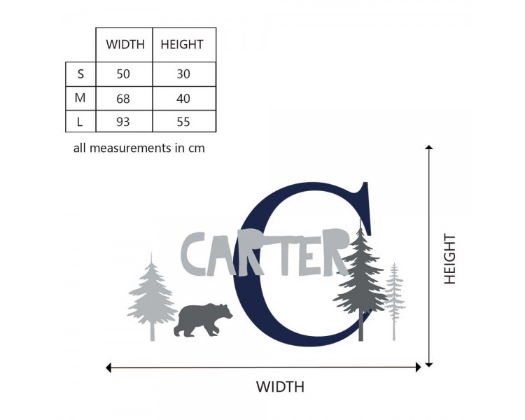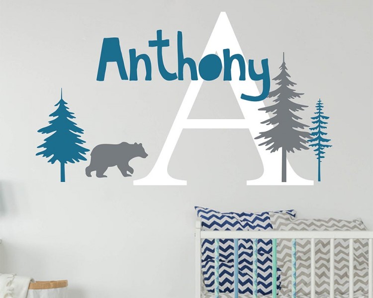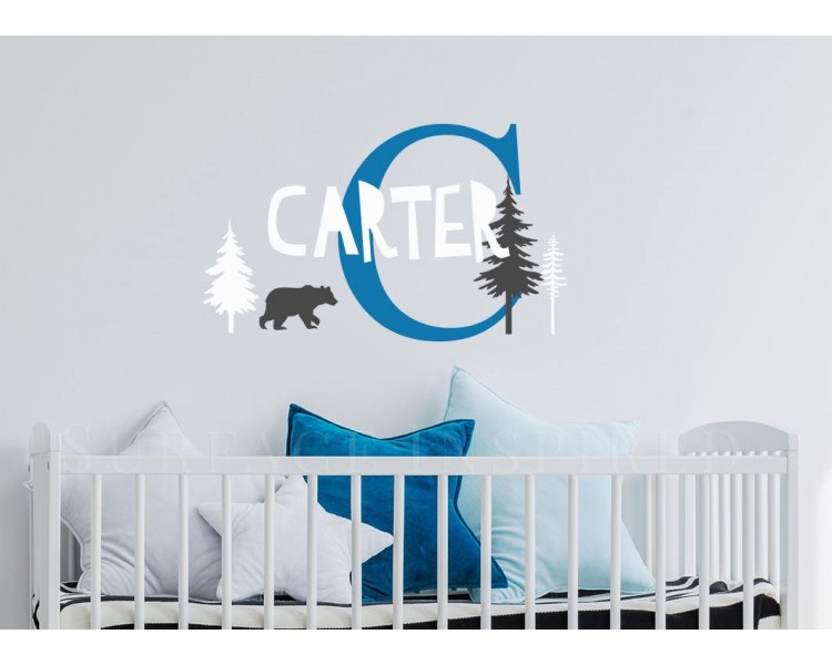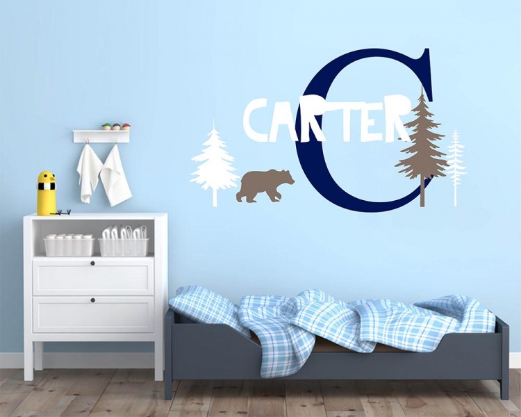 Scandinavian wall decal with personalized name, 3 trees, and a bear.